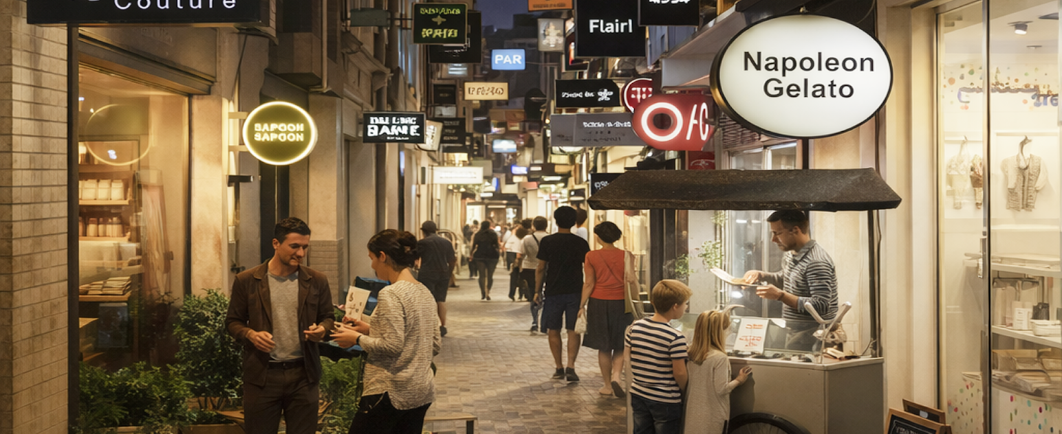Food and drink shape village life, with restaurants, vendors, cafés, and bars at The Kitchen, along Markham Street, and in Honest Ed’s Alley. The blend is diverse and intentional — from casual favourites to refined, experimental dining.